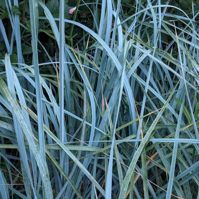 A bold ornamental grass with striking steel-blue foliage that adds strong vertical lines and color contrast to sunny landscapes. Spreads aggressively—ideal for erosion control and large open areas.