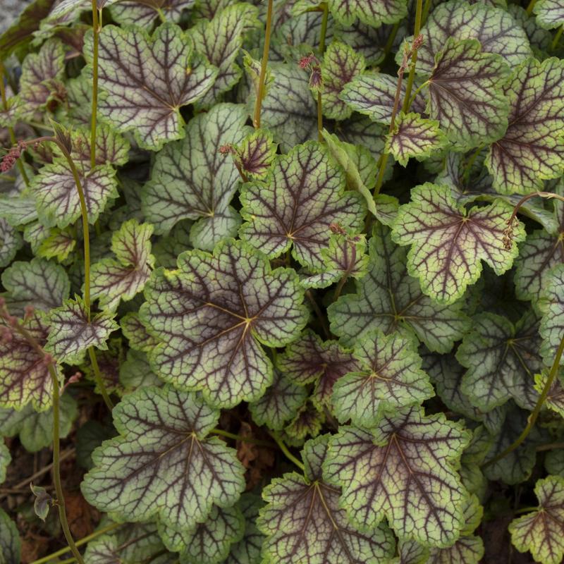 Striking silver-green foliage with deep purple veining and a hint of cinnamon around the edges. Provides bold texture and color contrast in shady borders, containers, or woodland gardens.