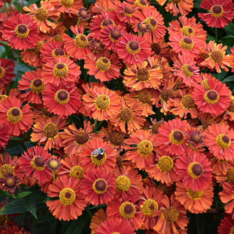 A compact, heavy-blooming sneezeweed that produces masses of rich orange-red daisies with golden centers from midsummer into fall. Strong stems, vibrant color, and a tidy habit make it ideal for borders, pollinator gardens, and late-season displays.