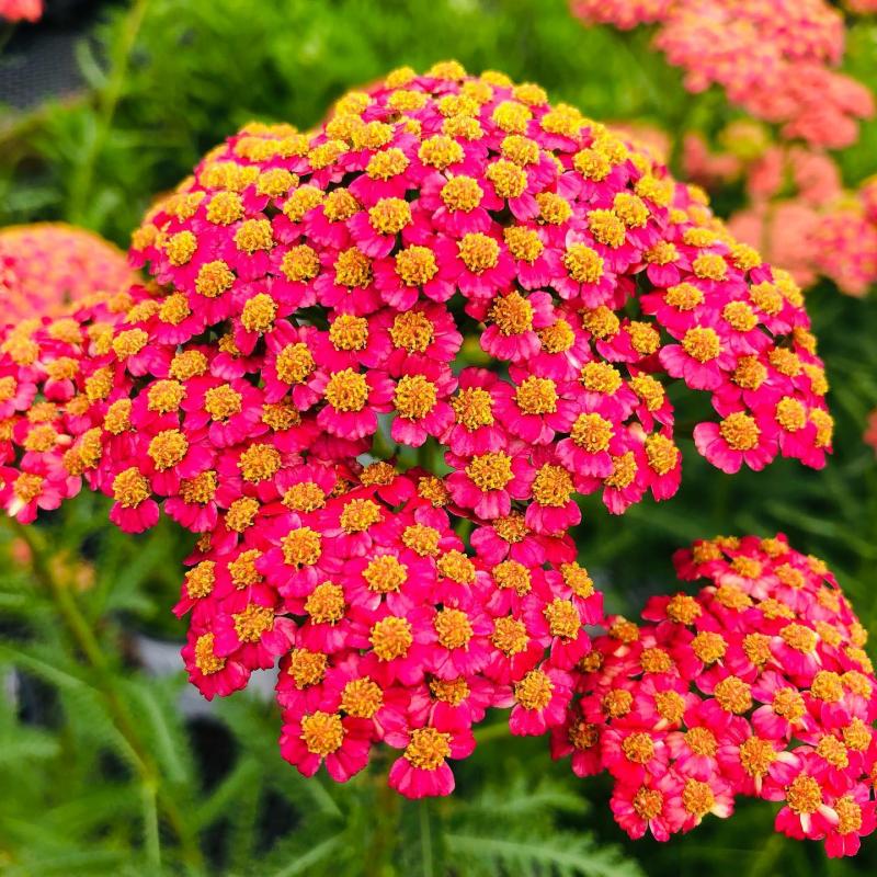 Flat clusters of vibrant peach-pink flowers with golden centers brighten sunny borders. Tall stems and a long bloom time make it great for cutting and pollinator gardens.