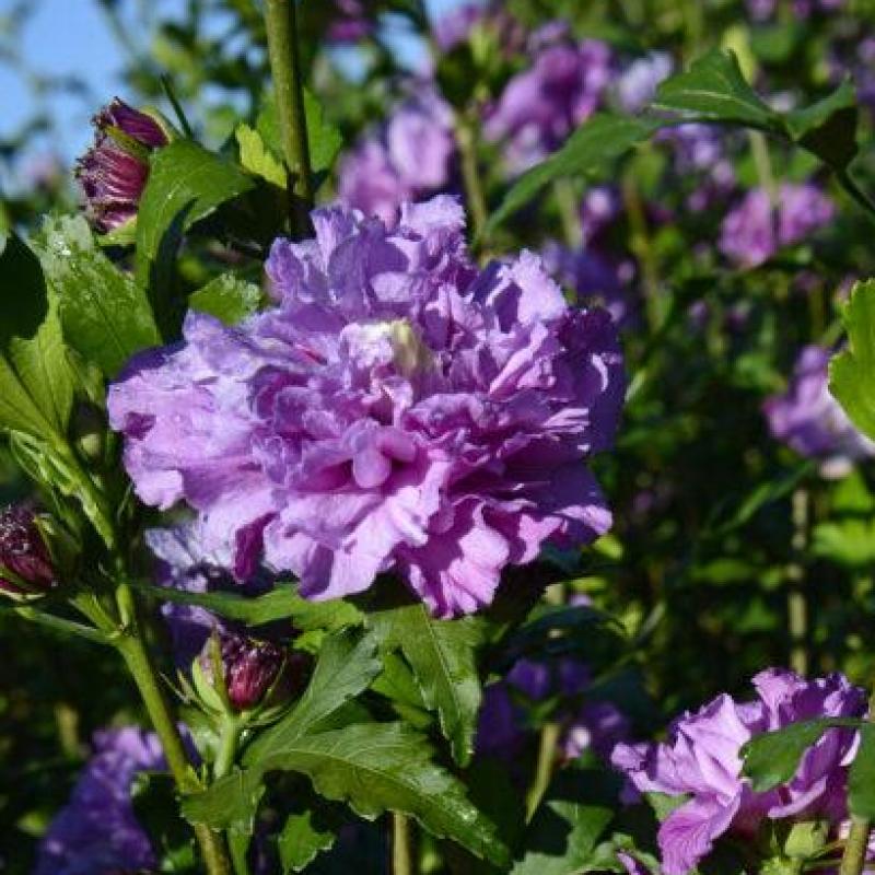 This purple variety has clusters of large sterile lavender-purple flowers that resemble pompoms for up to 8 weeks throughout the summer. It has an upright vase-shaped habit that is covered with flowers along the stems and is a vigorous grower.