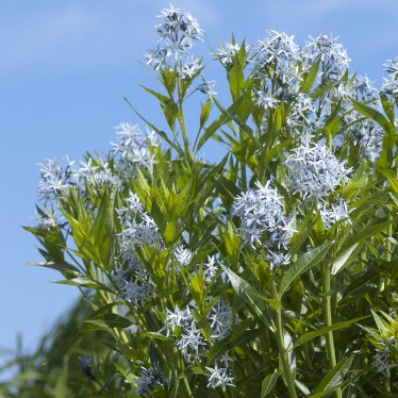 This variety features small, light blue, star-shaped flowers that appear in mid June on willowy foliage that has an excellent yellow fall color.