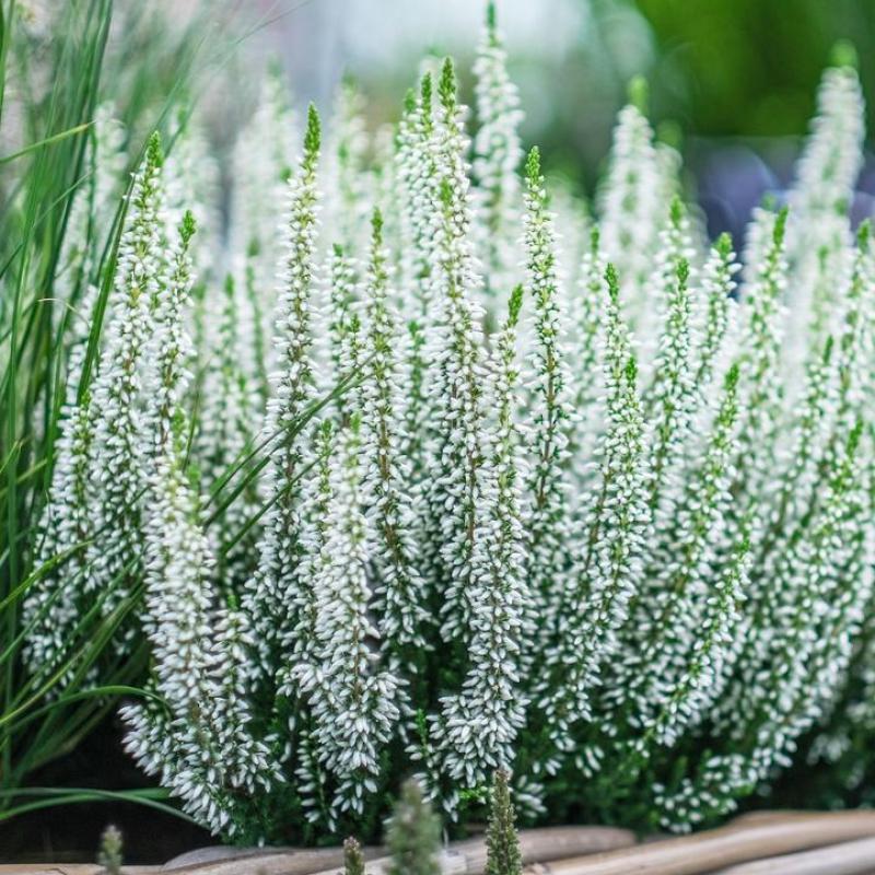 A crisp and elegant heather featuring upright white flower spikes that bloom late summer into fall. Its evergreen form and refined color make it ideal for mixed containers, rock gardens, or seasonal borders.