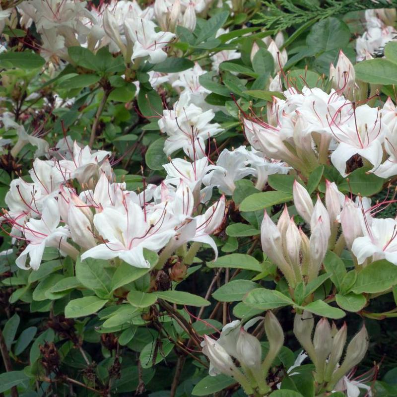 A graceful native deciduous azalea, prized for its clusters of fragrant white to pale pink flowers with red stamens in early to mid-summer. Adds beauty and fragrance to naturalized areas and woodland gardens.