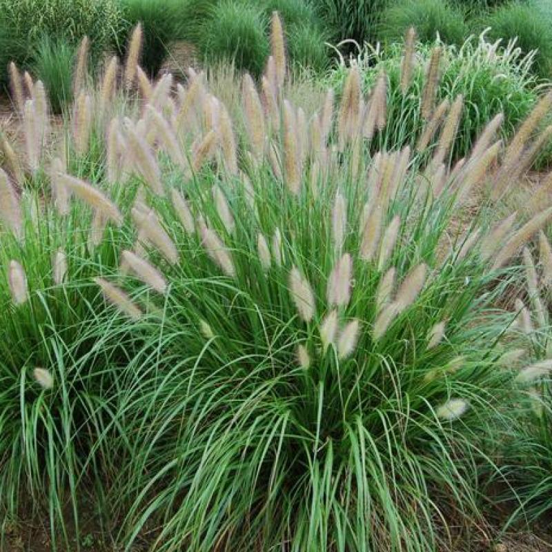 This selection forms a large mound of arching green leaves. Soft smoky-pink colored bottlebrush flower spikes appear from spring till fall, turning to buff as they dry. An infertile variety that does not reseed.