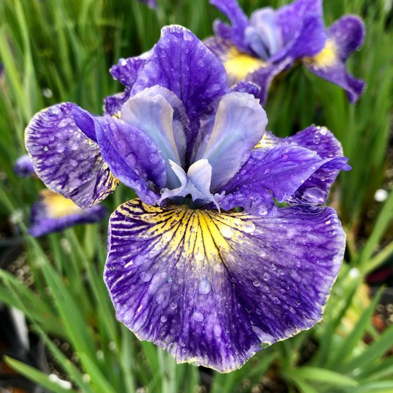 Dramatic bicolor blooms in violet-blue and soft lavender with golden highlights. Strong, upright foliage adds structure even after flowering.
