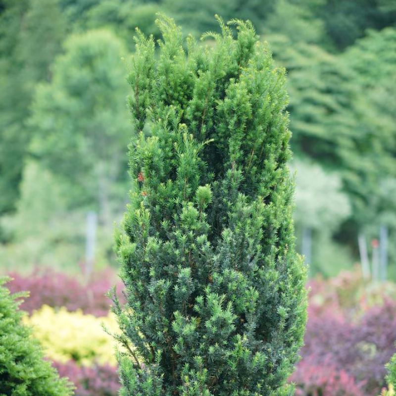 A narrow, upright evergreen with rich green needles and a formal appearance. Ideal for tight spaces, foundation plantings, or as a vertical accent in borders and mixed shrub beds. Tolerant of pruning and shade, making it versatile in the landscape.