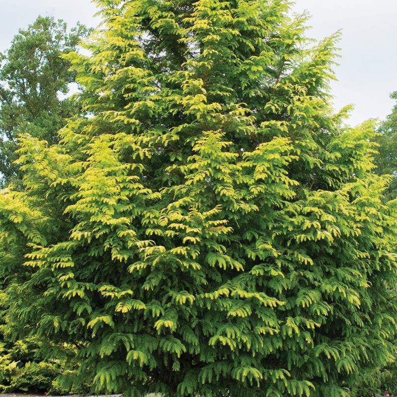 A golden-foliaged form of the ancient dawn redwood, ‘Amber Glow’ features feathery, soft needles in shades of chartreuse to amber-gold that hold their color through summer. Deciduous and pyramidal in form, it’s tolerant of moist soils and adds vibrant seasonal interest.