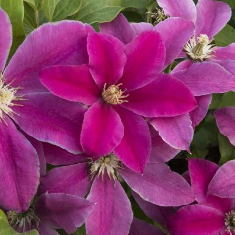 'Acropolis' offers striking pink flowers with a deeper pink stripe on each petal that will make a magical show! This compact Clematis is perfect for a small garden balcony, deck garden or patio. (Pruning Group 3)