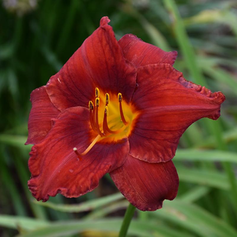 ‘Sun Dried Tomatoes’ is a richly colored daylily with deep, velvety brick-red blooms and a glowing golden-yellow throat. Blooming in midsummer, it delivers bold, dramatic color and excellent garden performance, forming a neat clump of arching green foliage that is both durable and easy to maintain.
