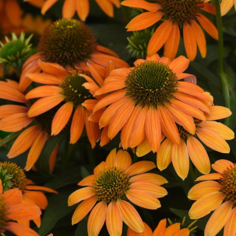 Warm, glowing orange petals surround golden-green centers on upright, sturdy stems. This long-blooming selection provides months of vibrant color and is beloved by pollinators and gardeners alike.