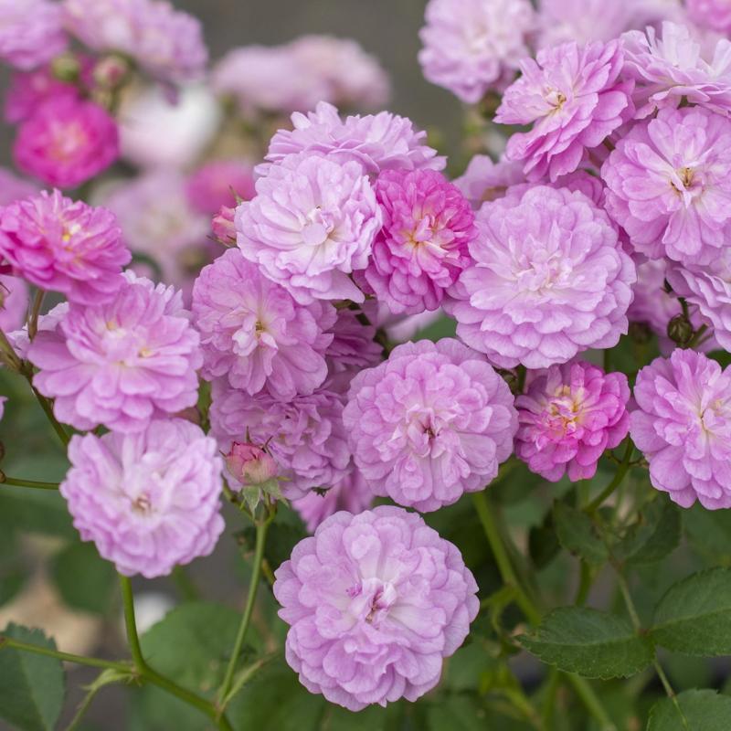 ‘Pretty Polly Lavender’ is a charming polyantha rose that produces clusters of small, fully double lavender-pink blooms all season long. Compact and floriferous, this low-maintenance shrub is ideal for borders, containers, or mass plantings, with excellent disease resistance and nonstop color.