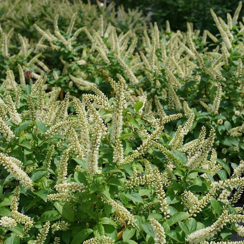 An unconventional Itea noted for its numerous, heavenward-shooting white, early summer flower spikes. A neat and tidy habit, in a container and in the garden, she has thick, dark green leaves which contrast nicely with the lightly fragrant, pure white blooms.