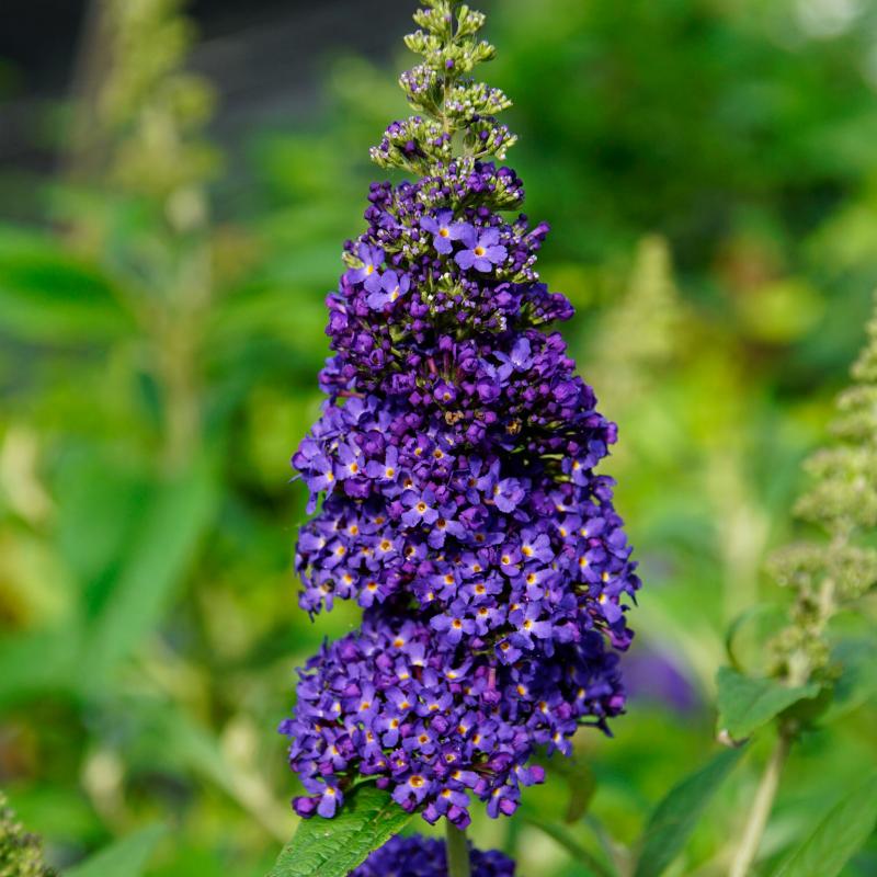 A compact butterfly bush featuring deep violet-purple flower spikes that bloom continuously from summer to frost. 'Buzz Midnight' attracts clouds of butterflies and hummingbirds while offering a tidy, dwarf form perfect for small gardens and containers. Heat tolerant and easy to grow.
