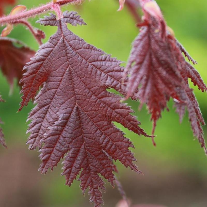 ‘Burgundy Lace’ offers stunning deep burgundy foliage that emerges in spring and maintains rich color through summer before turning vibrant red in fall. This ornamental hazel adds texture and contrast to the landscape with its broad, lace-edged leaves and graceful habit.
