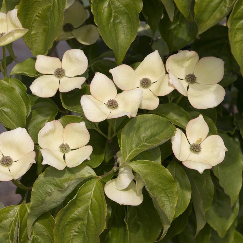 A vigorous hybrid dogwood combining the best traits of Cornus kousa and Cornus florida. In late spring, it is smothered with large creamy-white bracts that mature with a soft pink blush. Deep green foliage turns shades of red and purple in fall, while red fruit provides food for birds. Strong branching and disease resistance make it an excellent specimen tree.