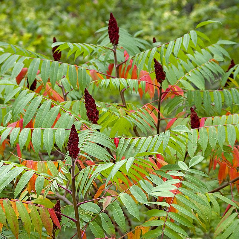 A bold native shrub or small tree with tropical-looking foliage, fuzzy young stems, and showy red fruit spikes that persist into winter. A dramatic choice for naturalized areas, slopes, and wildlife gardens.