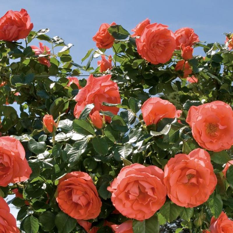A bold and vibrant rose with clusters of glowing orange blooms from spring through fall. Its compact, upright habit and glossy green foliage make it ideal for mass plantings, borders, or containers. Offers excellent disease resistance.