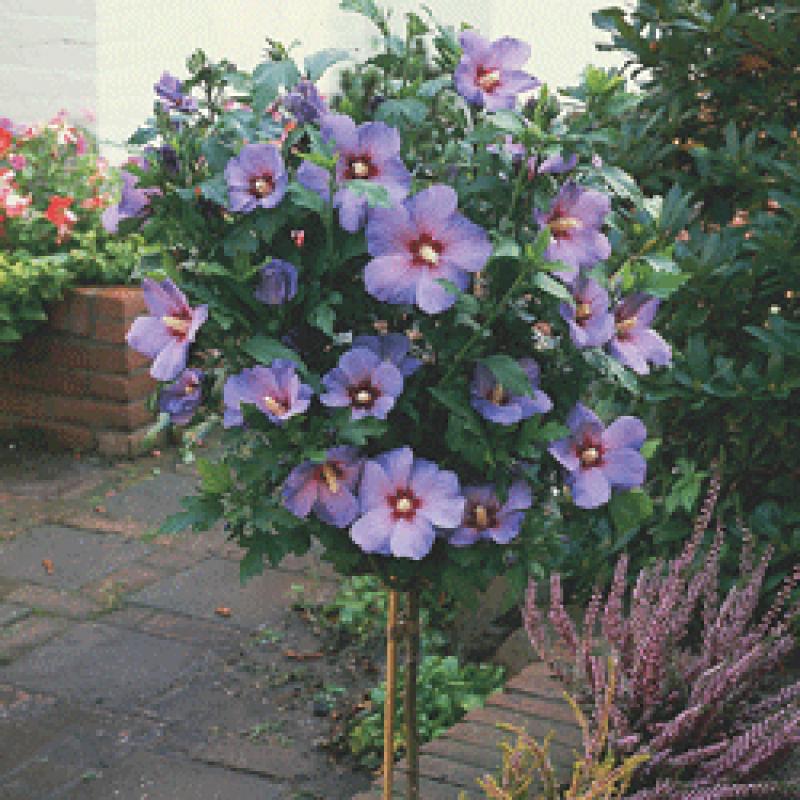 A myriad of large, lavender flowers with a pink overcast and a dark red eye emerge in August against lustrous dark green foliage. An upright shrub in youth that will round out with age, 'Minerva' will benefit from severe pruning during the spring.