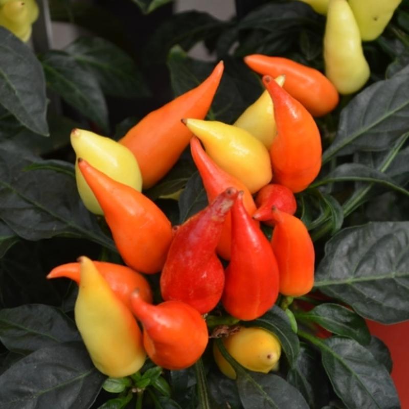 Blaze is a compact ornamental pepper grown for its eye-catching fruit that ripens from creamy yellow to fiery orange and red. Upright, cone-shaped peppers create a bold, colorful display against dark green foliage.