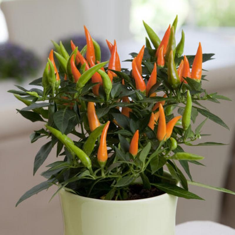 Santos Orange is a compact ornamental pepper prized for its bright orange, upright fruits that appear in abundance above glossy green foliage. Colorful and long-lasting, it adds bold contrast to containers and mixed planters.