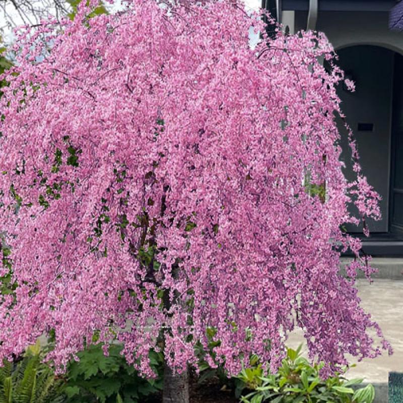A graceful ornamental cherry with a dramatic weeping form, perfect as a specimen tree in the landscape. In spring, branches are draped in masses of vibrant pink blooms, creating a waterfall of color. Its elegant shape and long-lasting flowers make it a focal point in gardens and entryways.
