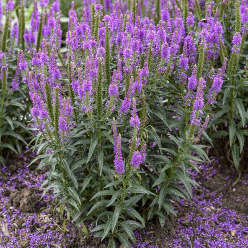 Upright spikes of vivid purple flowers rise above deep green foliage in a tidy, mounding habit. An excellent pollinator plant with a long bloom time and tidy shape.