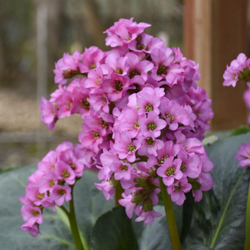 A standout Bergenia with large, glossy evergreen leaves and tall stalks topped with bright pink flower clusters in early to mid-spring. Excellent for adding bold texture and early color to shady or partially shaded gardens.