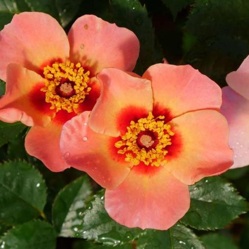 A vibrant, eye-catching shrub rose known for its unique color shift – soft peach petals with a striking red eye that ages to lavender tones. Blooming continuously from early summer through frost, this hardy and disease-resistant rose adds playful, ever-changing color to any landscape with minimal maintenance.