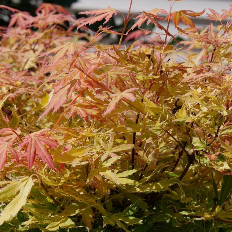 A shrubby Japanese maple is noted for the neat texture and ever-changing color of its foliage. In spring, the dissected foliage emerges yellow; a pink margin soon develops, then that shifts to white with shades of reddish-orange in summer. In autumn, the entire leaf transforms to orange-red and eventually red-violet.