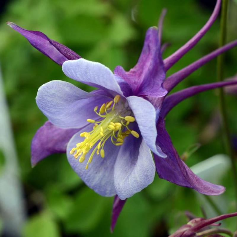 This compact columbine features striking purple-blue outer petals with contrasting pale centers and bright yellow stamens. Blooms early in spring and attracts pollinators with its unique, nodding flowers.