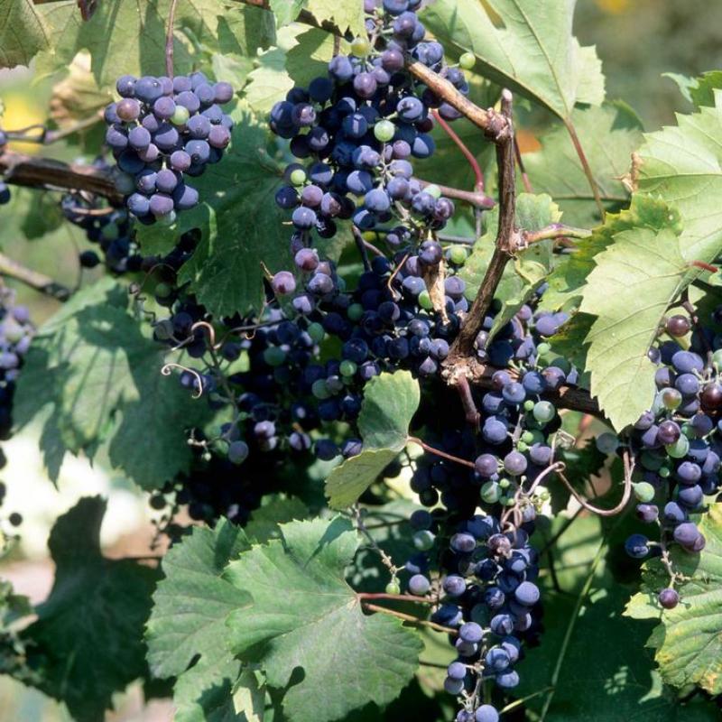 Cross-bred by the University of Minnesota, Frontenac has gained popularity among the Northeast due to its cold-hardy nature. Clusters of deep purple and round grapes flood the vines and are ready to harvest from early to mid-fall. Use the sweet tasting and juicy textured fruit in juices and wine for aromatic notes of peaches and apricots.