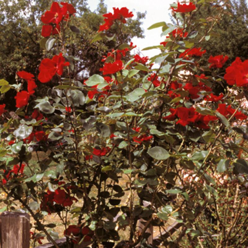 The medium sized, cupped, single, bright blood red flowers of 'Altissimo' show yellow stamens and a light clove fragrance amid deep emerald green leaves. Introduced in 1966.