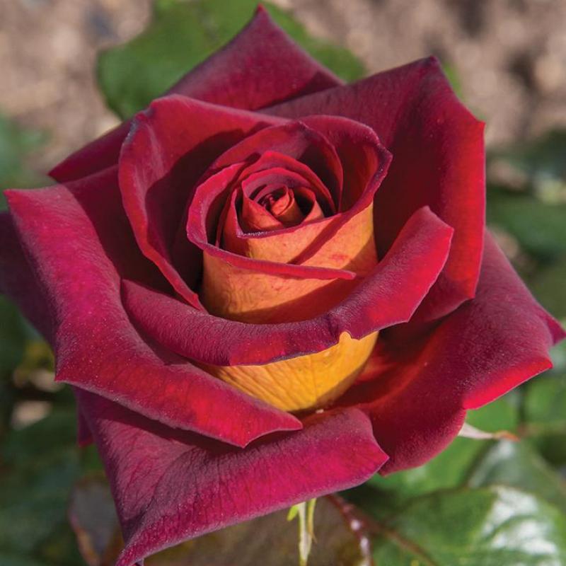 A dramatic hybrid tea rose featuring large, high-centered blooms with dark velvet-red petals and a golden base. Each flower offers a captivating contrast and mild fragrance. Ideal as a cut flower and standout in sunny beds or borders.