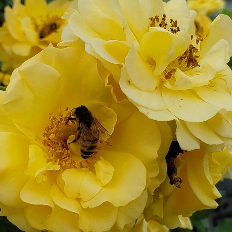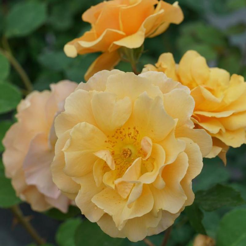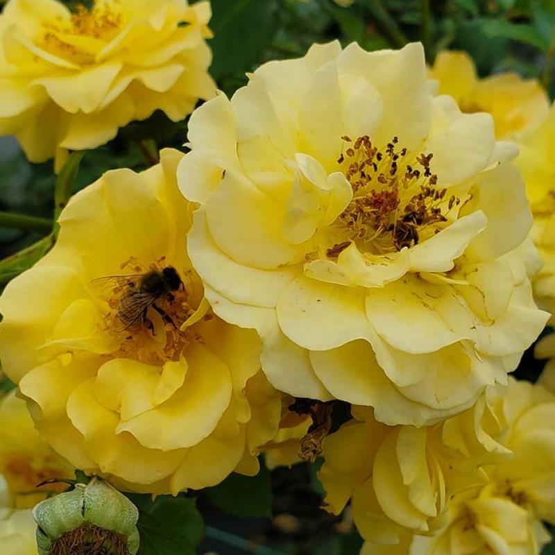 A cheerful, disease-resistant climbing rose featuring soft amber-yellow blooms with open centers that are rich in pollen. Flowers appear in clusters from early summer through fall on a vigorous, well-branched plant.