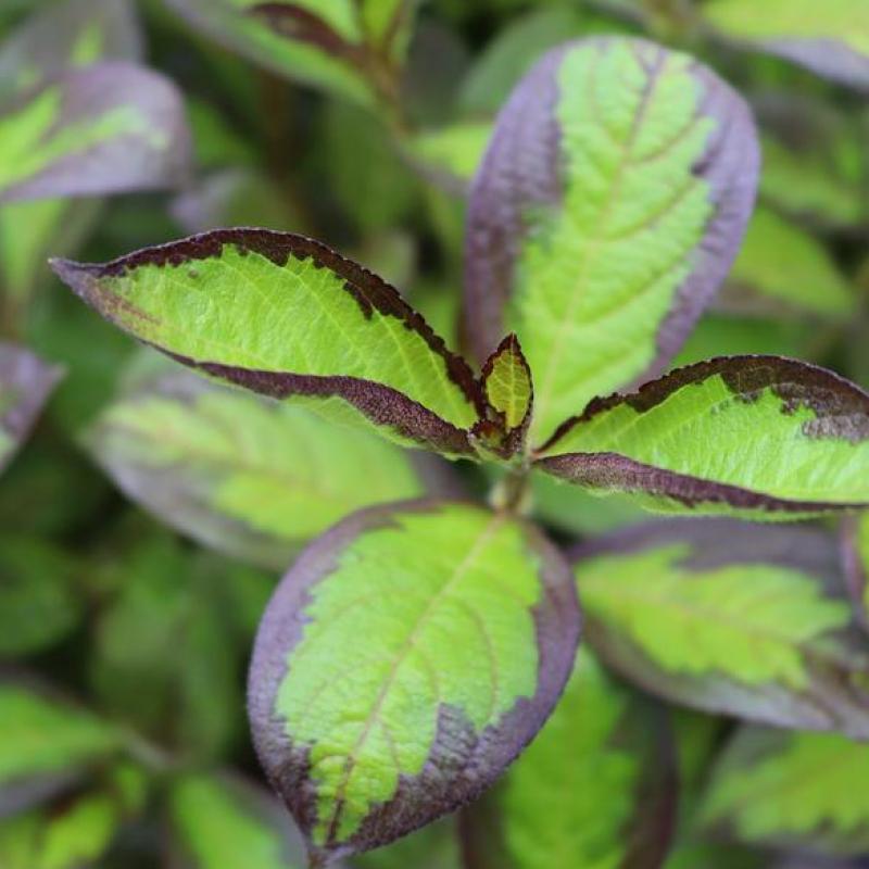 There’s nothing else quite like Vinho Verde weigela! After years of positive feedback from trial garden visitors during its evaluation, we're pleased to off this unique selection, characterized by lime green leaves set off with a bold, black margin. Discovered as a variegated sport on a seedling whose parents were golden ‘Briant’s Rubidor’ and burgundy ‘Naomi Campbell’. Like all variegated plants, it will occasionally revert, but it reverts to all black, so will not overgrow the plant. A light crop of red-pink flowers appear in late spring, but the foliage - coupled with an irresistibly neat habit - are the primary reasons to grow this beauty.