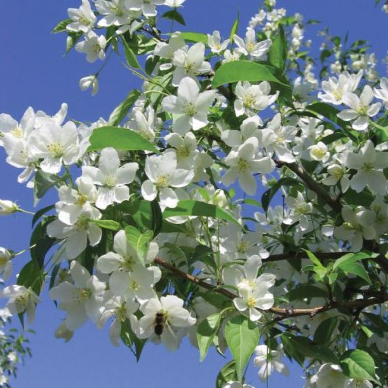 A compact, upright crabapple with profuse white spring blooms that dazzle against glossy green foliage. Small, bright red fruits persist into winter, attracting birds and adding ornamental interest. Disease-resistant and cold-hardy—great for streetscapes or small yards.