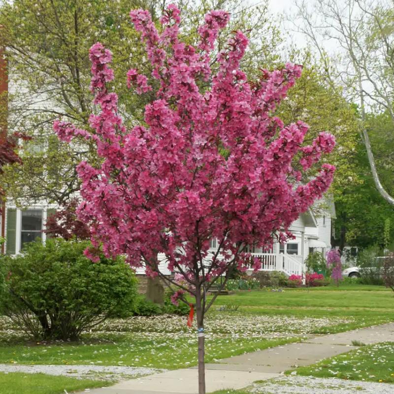 An outstanding flowering crabapple with masses of deep pink to fuchsia-red blooms in spring that completely cover the branches. Glossy green foliage provides a clean summer look, while persistent small red fruit attract birds into fall and winter. A disease-resistant, hardy variety that delivers spectacular seasonal color.