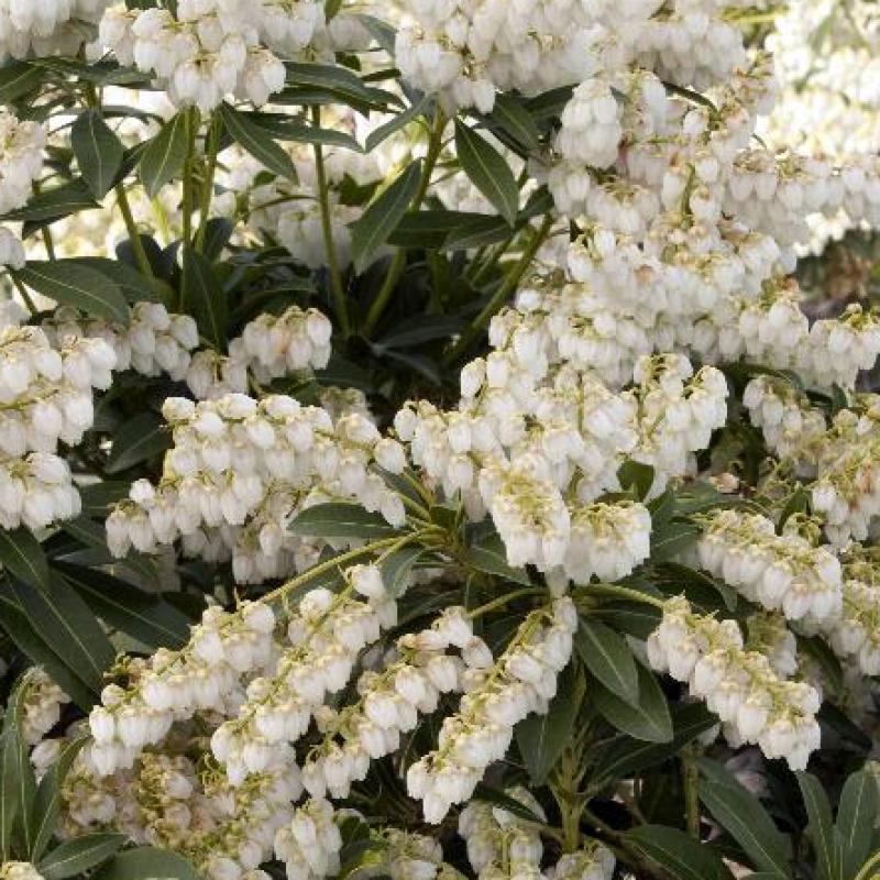 This compact evergreen shrub features dense, glossy green foliage and profuse clusters of pure white, urn-shaped flowers in early spring. 'Purity' offers a refined look and year-round interest, perfect for foundation plantings or woodland gardens.