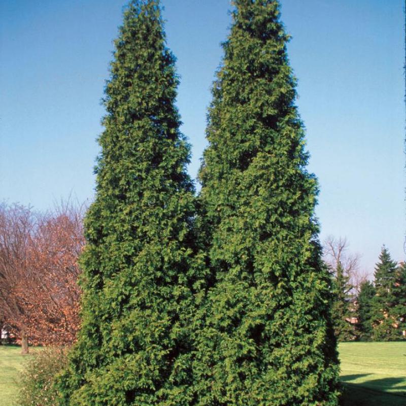 A tall, narrow evergreen with dense, rich green foliage and a strong central leader. ‘Spring Grove’ is prized for its uniform, upright habit and reliability, making it an excellent choice for screens, windbreaks, or vertical accents in the landscape.