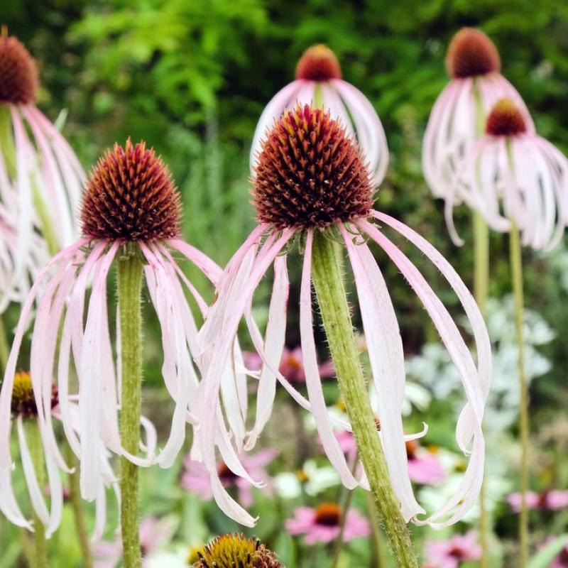 A native prairie coneflower known for its unique, narrow pale-pink petals that droop gracefully beneath prominent copper-orange centers. Blooms early to midsummer and provides nectar for pollinators while seeds feed birds. A hardy, drought-tolerant wildflower for naturalistic plantings.