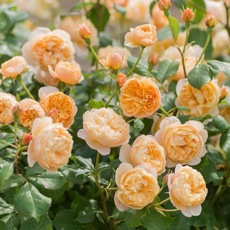 Compact English shrub rose with perfectly cupped, soft apricot-orange blooms. Free-flowering with a strong, fruity tea fragrance. Excellent for beds, borders, and cottage gardens.