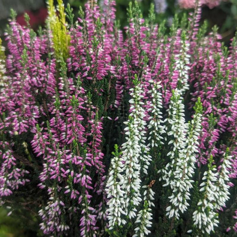 ‘Trio’ combines three vibrant heather varieties in one plant, offering a colorful mix of pink, white, and lavender blooms on compact, upright stems. This multicolored display provides long-lasting interest from late summer through fall and brings year-round texture to containers or garden borders.