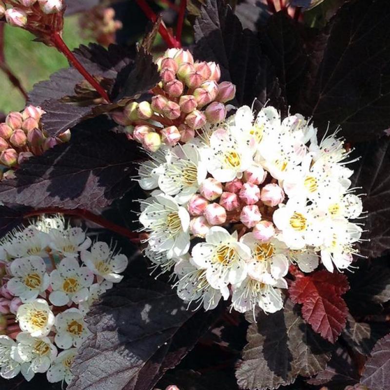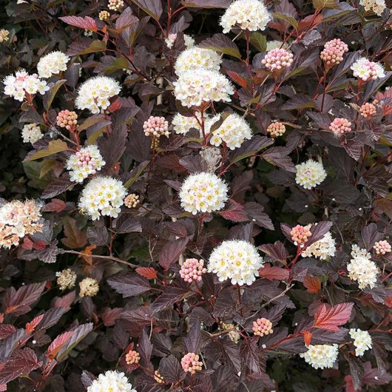 This pollinator magnet has color in abundance with leaves on its fast growing, rounded form starting the spring red and morphing first to bronze then nearly black as the season progresses. Fists of pink tinged white flowers cover the plant in May and June making it abuzz in pollinator activity!