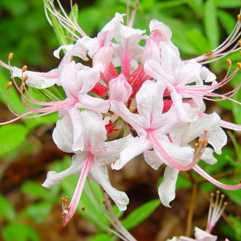 A beautiful native deciduous azalea producing clusters of soft pink, trumpet-shaped flowers in late spring before the leaves fully expand. The fragrant blooms attract butterflies and pollinators, while the shrub provides seasonal interest with bright green summer foliage and attractive fall color.