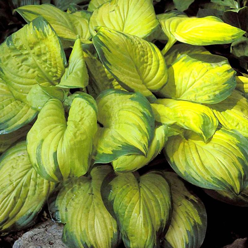 'Stained Glass' is a very shiny leaved sport of 'Guacamole' with ribbed leaves that are mostly yellow-green and edged in deep green margins. Fragrant lavender flowers in July complete the look.