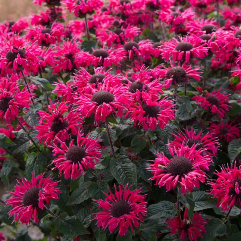 The soft red flowers of 'Bee Happy' have colorful bracts that add to the depth of flower color. The blooms will last from late June thru August with deadheading amid deep green, aromatic foliage that forms a compact mound.