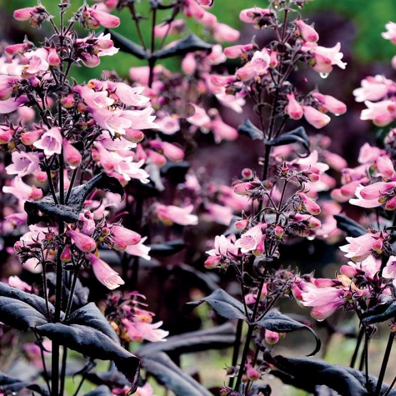 Striking dark foliage contrasts beautifully with light pink tubular blooms in early summer. This tough native cultivar is drought tolerant, pollinator friendly, and adds bold texture to sunny landscapes.