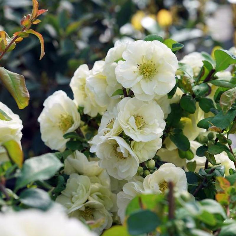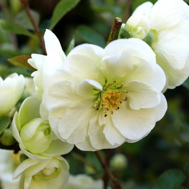 A new, continuously flowering, thornless quince with big, double white flowers that provide visual impact even when the plant is in full leaf. DOUBLE TAKE ETERNAL WHITE quince is the longest-blooming flowering quince on the market. Its large doubled blooms appear in spring, and the show continues for months, often into early autumn. The delicious, camellia-like flowers open lime and then transition to pure white and the dark green foliage adds the perfect contrast. This quince is a lower, wider growing shrub than the other Double Take varieties, making it useful in many landscape areas.
