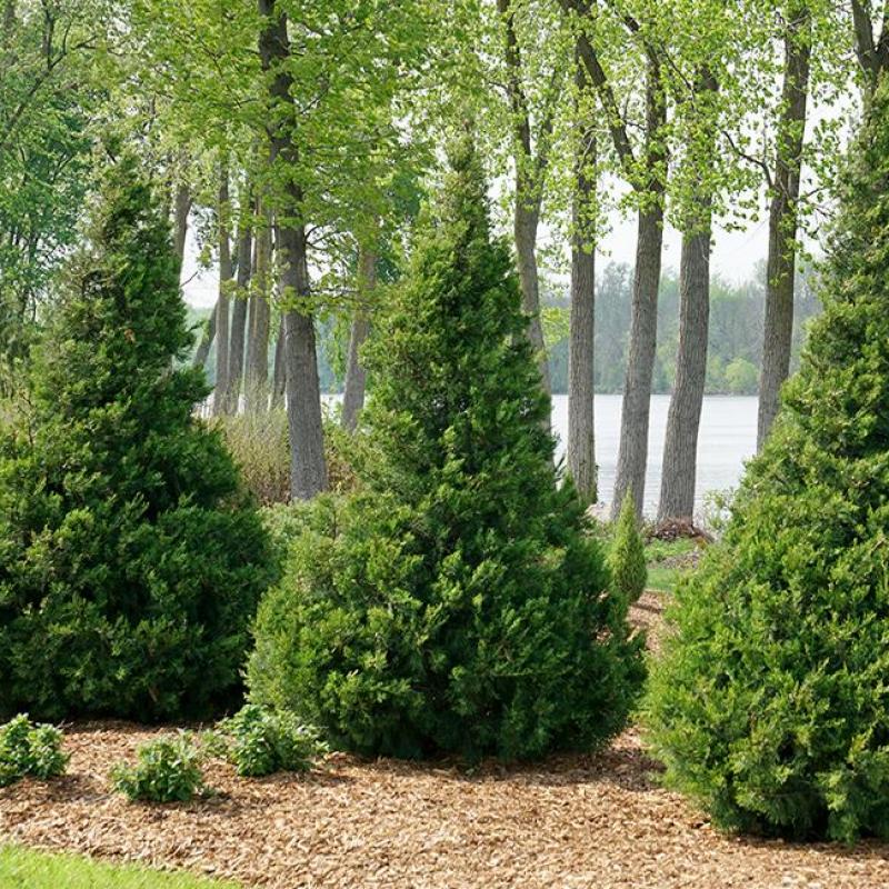 A narrow, upright evergreen juniper with soft, bright green foliage that holds its color year-round. ‘Gin Fizz’ has a refined, columnar habit that works beautifully as a screen, vertical accent, or modern alternative to arborvitae. Extremely cold hardy and tolerant of wind, salt, and drought once established.